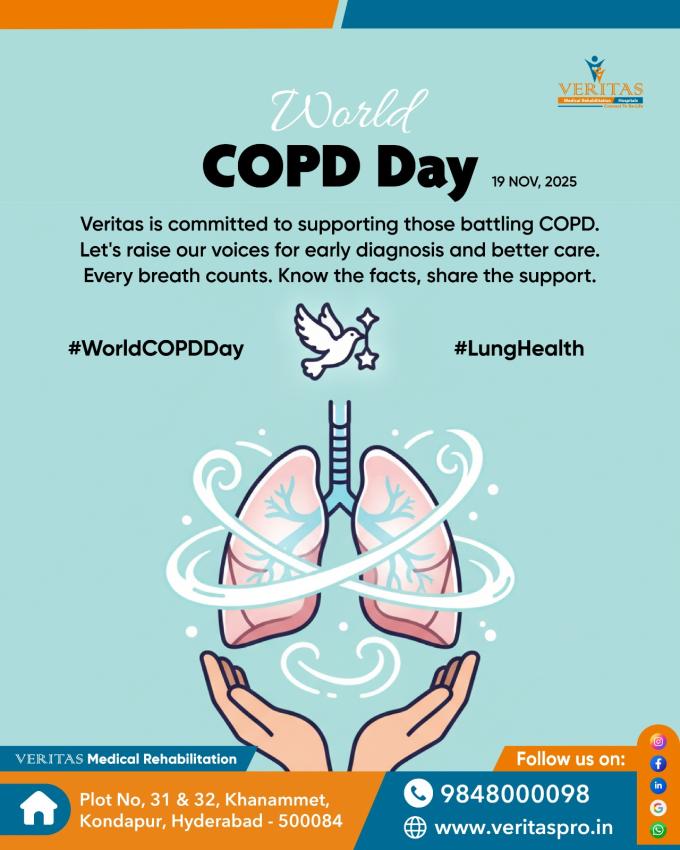 #VeritasRehabAndHospitals #BestRehabCenterInHyderabad #WorldCOPDDay #COPDAwareness #LungRehab #RespiratoryHealth #PulmonaryRehabilitation #BreatheBetter #FunctionalRecovery #HolisticHealing #RehabCare