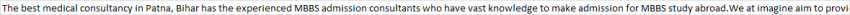Description : The best medical consultancy in Patna, Bihar has the experienced MBBS admission consultants who have vast knowledge to make admission for MBBS study abroad.We at imagine aim to provide the best Education consultants for MBBS and proper educational facilities for our students.
